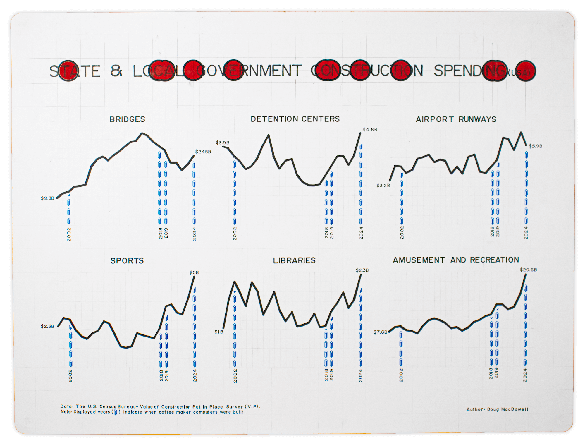 Each visualization is drawn by hand using pre-computer drafting tools: t-square, triangle, rulers, lettering kit, and templates. Rather than the 20 minutes a computer would take, each drawing requires 20–30 hours. Part of the art exhibition Sparklines, these and other hand-drafted data visualizations accompany a coffee maker computer.